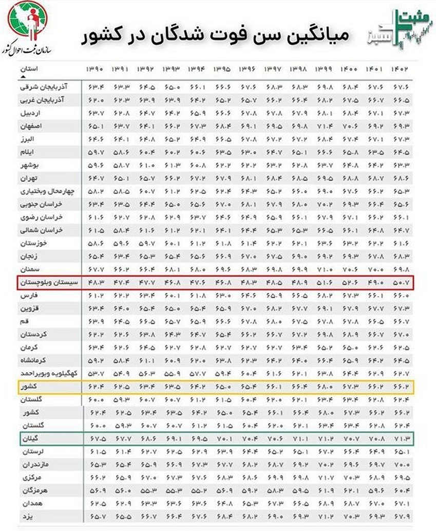 میانگین عدد سن امید به زندگی در ایران برای هر دو جنسیت (مردان و زنان) ۷۷.۳۳سال، برای زنان ۷۸.۵۴سال و برای مردان ۷۶.۲۲سال است. در سال ۱۳۹۰، میانگین سن متوفیان استان سیستان و بلوچستان در آمار ارائه شده سازمان ثبت احوال، حدود ۴۸ سال بوده. تا سال ۹۵ میانگین سن متوفیان در این استان کاهشی بوده و حتی به حدود ۴۷ سال رسیده. طی سه سال بعد این عدد افزایش پیدا کرده و حتی در سال ۱۴۰۰ به ۵۰ سال رسیده. اما در سال ۱۴۰۱ دوباره افت کرده تا اینکه هم ‌اکنون این عدد به ۵۰.۷ سال رسیده است. عددی که فاصله حدود ۳۰ ساله با شاخص «امید به زندگی » در کل ایران دارد.