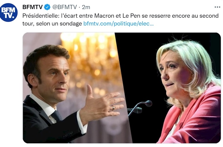 به گزارش سی ان ان با پایان شمارش ۹۸ درصد آرا، امانوئل مکرون و مارین لوپن به دور دوم انتخابات فرانسه رفتند و دو هفته دیگر، فرانسویها یکی از این دو را به عنوان رئیس جمهوری جدید کشور انتخاب خواهند کرد مکرون به عنوان یک لیبرال اقتصادی و گلوبالیست از یک طرف و لوپن به عنوان یک ملیگرای اقتصادی عمیقا بدبین به اروپا و مخالف ناتو خواهد بود. خانم لوپن تا پیش از جنگ اوکراین بارها از ولادیمیر پوتین، رئیس جمهوری روسیه، ستایش کرده بود.