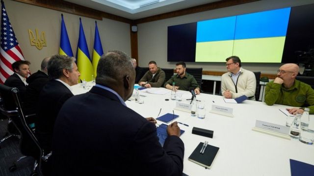در این میان وزرای امور خارجه و دفاع آمریکا روز یکشنبه برای گفتگو با ولودیمیر زلینسکی رئیس جمهور اوکراین وارد کیف پایتخت اوکراین شدند و با وی دیدار کردند زلنسکی بدون اشاره به جزئیات این دیدار گفت مقامات آمریکایی اگر آماده تحویل سلاح نبودند، نباید به اینجا می آمدند.وی افزود که با بلینکن و آستین درباره انواع تسلیحات مورد نیاز اوکراین برای مقابله با حملات روسیه گفتگو خواهد کرد.سفر آستین و بلینکن به کیف اولین سفر مقامات دولت آمریکا به اوکراین از زمان آغاز تهاجم نظامی روسیه به اوکراین در ۲۴ فوریه است. پیش از این، شماری از رهبران جهان از جمله روسای جمهور ترکیه و فرانسه با هدف کاهش تنش و ختم جنگ، دیدارهای با ولادیمیر پوتین و ولادمیر زیلینسکی داشته اند.